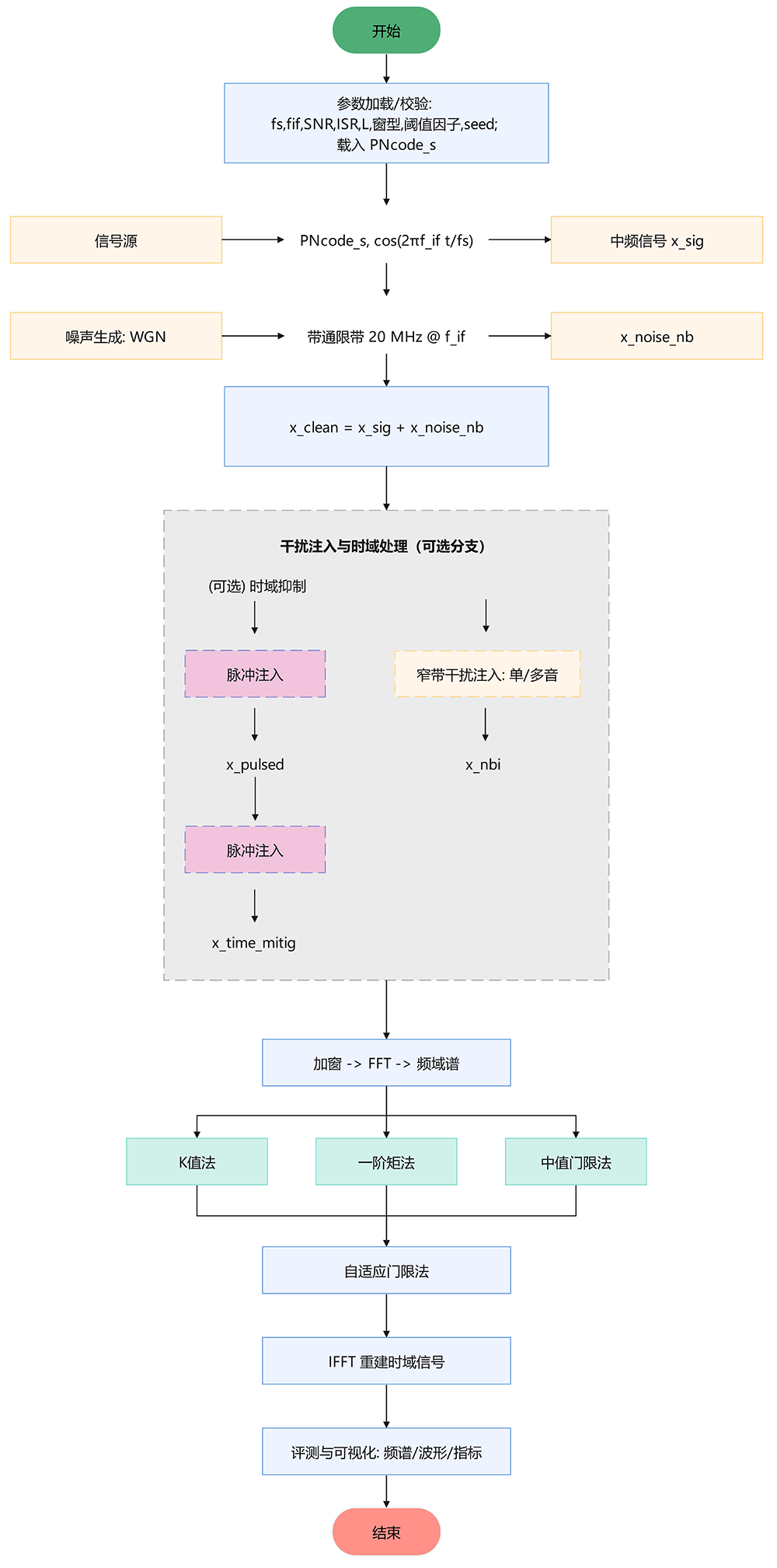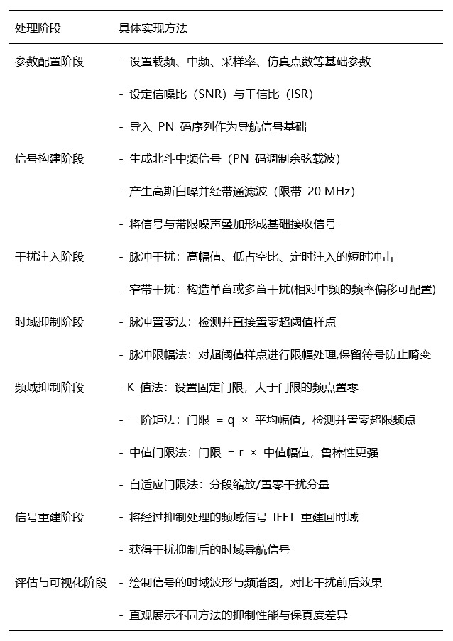 本系统旨在实现基于北斗中频信号的抗脉冲干扰与抗窄带干扰仿真验证。系统的核心目标是在复杂电磁环境下,通过典型的时域与频域干扰抑制算法(如脉冲限幅、脉冲置零、K 值法、一阶矩法、中值门限法以及自适应门限法),对受干扰的导航信号进行有效恢复与分析,从而评估不同算法的抑制效果与适用场景。